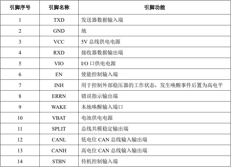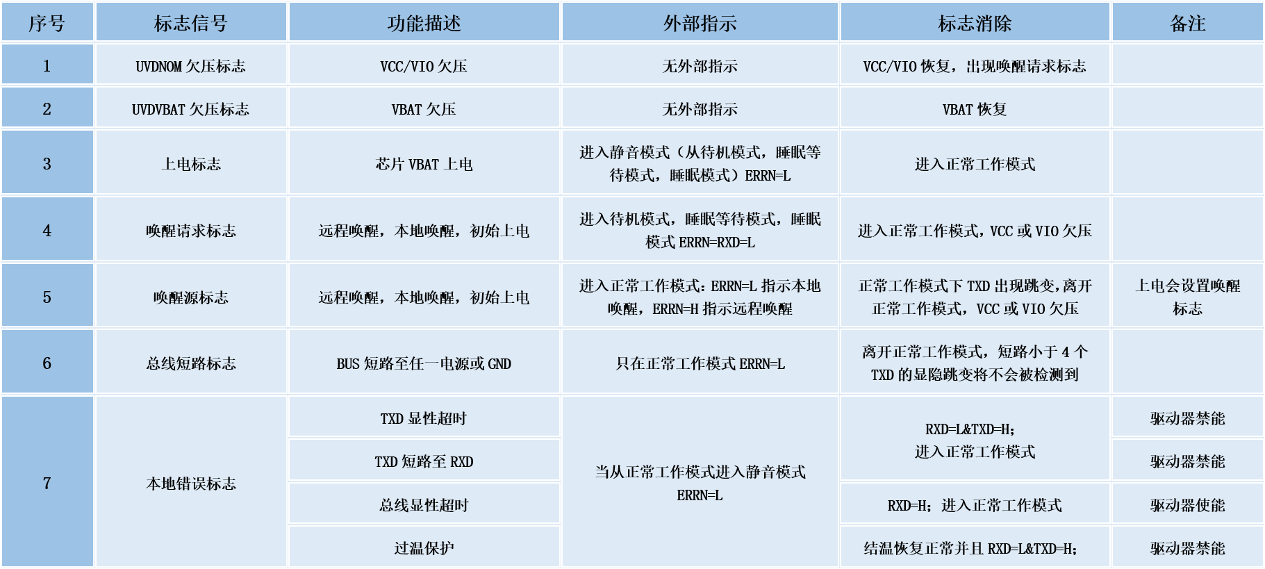 SIT1043Q使用7個內部標志來實現(xiàn)故障安全的回退模式控制和系統(tǒng)診斷。主控制器可以通過引腳ERR_N輪詢其中的五個標志,功能標志執(zhí)行操作如下表1所示。